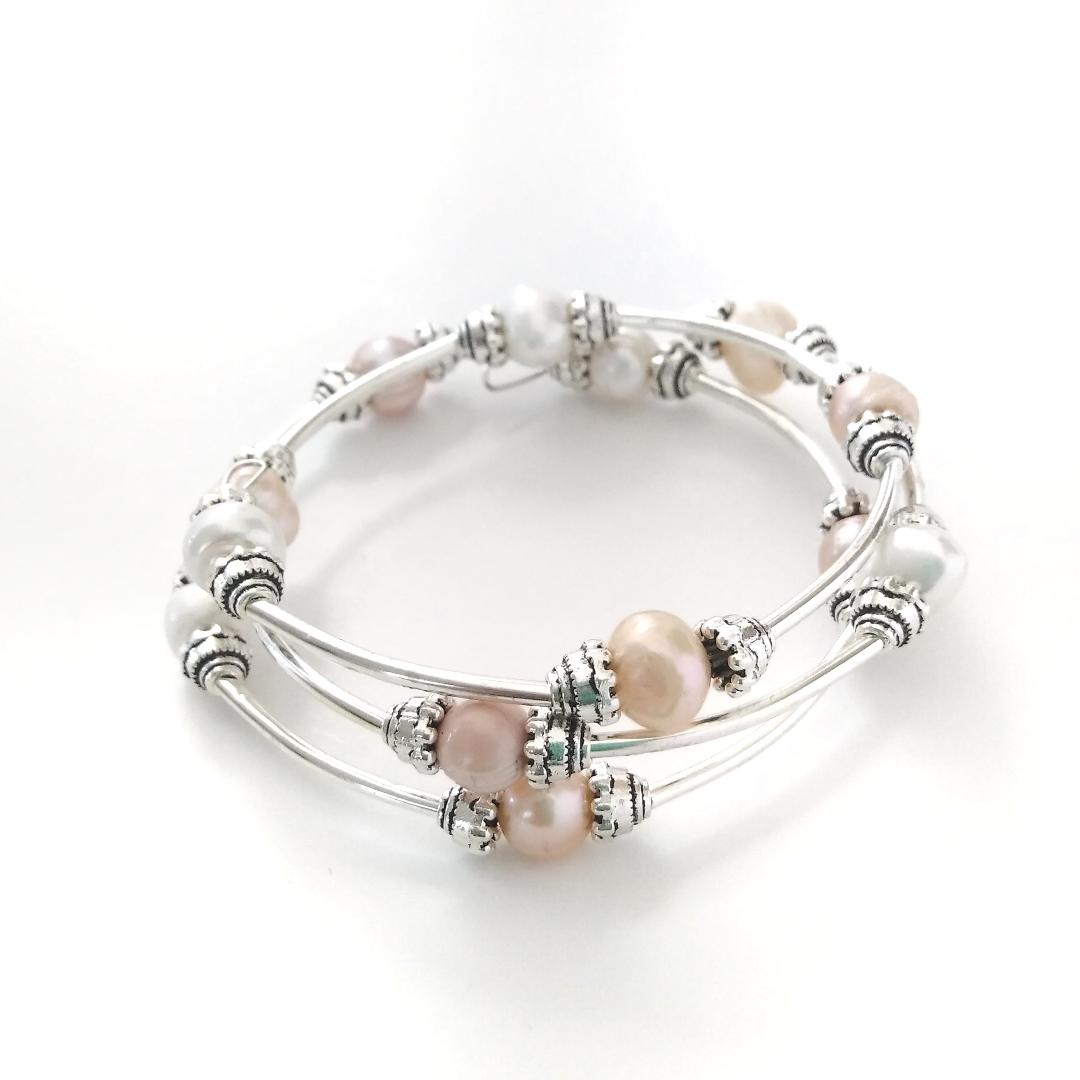 Adorable snake wrap pearl bangle. Creamy pink and white pearls add that touch of class to any outfit.